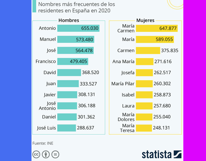 Sociedá Antonio y María Carmen son los nomes más frecuentes n’España by redacción asturnews 26 de xunetu, 2021 written by redacción asturnews 26 de xunetu, 2021 4,2K En total, n’España hai 655.030 homes que se llamen Antonio, a los que siguen Manuel (573.480) y José (564.478) y hai 647.877 muyeres que llámense María Carmen, ente que 589.055 comparten el nome de María. Esos son los nomes cimeros de la xente nel nuesu estáu. Antonio ye tamién el nome más frecuente en quince provincies españoles. Ente elles, Albacete, Alicante, Almería, Baleares, Barcelona, Cáceres, Ciudá Real, Córdoba, Granada, Huesca, Xaén, Madrid, Málaga, Murcia y Les Palmes. Con al respective de les muyeres, 647.877 llámense María Carmen, ente que 589.055 comparten el nome de María, y 375.835 facer con Carmen. María Carmen ye’l nome más popular en toles provincies sacante n’Albacete, Alicante, Almería, Badayoz, Baleares, Barcelona, Cáceres, Castellón, Cuenca, Girona, Huelva, Huesca, Xaén, Lleida, Málaga, Murcia, Tarragona, Teruel, Zaragoza y Melilla. Fuente: https://es.statista.com 0 FacebookTwitterPinterestEmail Anterior Coldplay va publicar nuevu discu, ‘Music of the spheres’, n’ochobre siguiente La Fundación de Cultura entama la V Parees con un mural dedicáu a Uviéu Tamién te podria gustar Asturnews va tornar tres del branu con nuevu... Iniciativa pol Asturianu y Barbón desixen a Adif... Iniciativa reclama un mandatu marcu na RTPA Payares acueye les XLI Xornaes Internacionales d’Estudiu de... L’Atles llingüísticu del Navia-Eo ponse n’accesu llibre Aína entama’l cursu políticu con un actu n’Uviéu La Delegación asturiana en Lorient protagoniza la xornada... La UABRA aporta a la segunda selmana d’actividaes 4200 firmes sofiten la música n’asturianu en XIxón Blanca Fernández foi la pregonera de la XXVII...