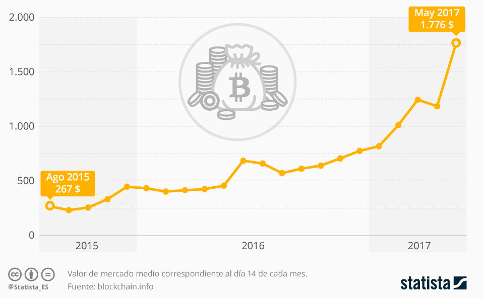 SociedáTecnoloxía Bitcoin sigue siendo una moneda en puxanza by redacción asturnews 28 de mayu, 2017 written by redacción asturnews 28 de mayu, 2017 141 La palabra Bitcoin volvió saltar a tolos medios de comunicación pol programa dañible WannaCry, qu’esti mes afectara a más de 220.000 ordenadores nel mundu. Pa recuperar l’accesu a los documentos secuestraos, l’afectáu pol virus tenía de pagar un rescate” d’a partir de 300 dólares estadounidenses en criptomonedes Bitcoin, que poles sos característiques técniques nun son rastreables. Como amuesa esta infografía de Statista, el valor mediu del Bitcoin multiplicóse por 6,65 dende’l 14 agostu de 2015, pasando de 267 dólares estadounidenses de valor de media nesti momentu a 1.776 dólares el 14 de mayu d’anguaño, según Blockchain.info. Esta infografía amuesa’l preciu de mercáu de la criptomoneda BitCoin (en dólares estadounidenses). 0 FacebookTwitterPinterestEmail Anterior WhatsApp y fecabook siguen siendo les aplicaciones preferíes n’España siguiente El 25% del alumnáu de FP y Bachiller cree qu’entá nun esiste’l puestu nel que va trabayar Tamién te podria gustar Asturnews va tornar tres del branu con nuevu... Iniciativa pol Asturianu y Barbón desixen a Adif... Iniciativa reclama un mandatu marcu na RTPA Payares acueye les XLI Xornaes Internacionales d’Estudiu de... L’Atles llingüísticu del Navia-Eo ponse n’accesu llibre Aína entama’l cursu políticu con un actu n’Uviéu Ventanielles y Guillén Lafuerza van ser una “Fábrica... La Delegación asturiana en Lorient protagoniza la xornada... La UABRA aporta a la segunda selmana d’actividaes 4200 firmes sofiten la música n’asturianu en XIxón