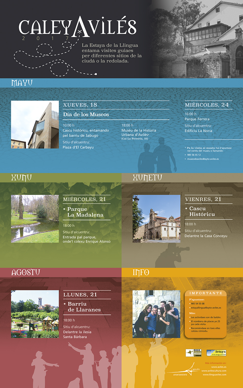 Turismu CaleyAvilés programa seis visites p’afondar na historia de la nuestra ciudá by redacción asturnews 7 de xunetu, 2017 written by redacción asturnews 7 de xunetu, 2017 158 La Estaya de la Llingua del Conceyu d’Avilés entama, pela segunda vez, el ciclu d’actividaes CaleyAvilés, nel que nesta ocasión van incluise, dende’l vienres 21 de xunetu, seis visites guiaes per diferentes sitios de la nuestra ciudá, lo que duplica les visites de la edición anterior. CaleyAvilés ufre la posibilidá de conocer en llingua asturiana los entornos naturales y urbanos de la villa y la redolada. Esti añu ye la segunda edición que se fai depués del éxitu del añu pasáu. La mayoría de les visites entamaes en 2016 tuvieron qu’ampliar el númberu de places. Mesmamente, participó n’elles xente d’otros conceyos d’Asturies -sobre manera d’Uviéu y Xixón- que quixeron conocer meyor la historia y los requexos d’una ciudá milenaria. Ye de reseñar qu’esti ciclu surdió depués del éxitu de les dos visites feches nel 2015 al Parque Ferrera y de la que s’entamó en mayu del 2016 nel Muséu de la Historia Urbana d’Avilés, que coincidió col Día Internacional de los Museos -visita que vuelve a repetise esti añu-. El programa d’actividaes pa esti 2017 ye’l que vien darréu: Vienres, 21 de xunetu -18.00 hores. Cascu Históricu Sitiu d’alcuentru: Delantre la Casa Conceyu (El Parche) Llunes, 21 d’agostu -18.00 hores. Barriu de Llaranes Sitiu d’alcuentru: Delantre la Ilesia Santa Bárbara Toles visites son de baldre. El númberu de places disponible pa cada actividá ye de 25 persones y recomiéndase llevar calzáu cómodu. P’apuntase hai que llamar al teléfonu 985 54 55 08 o unviar un corréu electrónicu a estayallingua@ayto-aviles.es. 0 FacebookTwitterPinterestEmail Anterior El Muséu d’Avilés entama 6 talleres infantiles pa neños y neñes d’ente 4 y 12 años siguiente La conceyalía d’Urbanismu del conceyu d’Uviéu prioriza les obres plantegaes por Educación y concede dos llicencies d’obres en colexos Tamién te podria gustar Uviéu programa’l ciclu Vetusta Jazz con artistes como... Una ventena de países africanos xúnense al Foru... Xixón va acoyer el V Alcuentru de la... Presentáu’l segundu capítulu de ‘Gijonomía’: una hestoria de... Nueva ruta de realidá aumentada na Casa Natal... Cirque du Soleil representará en Xixón OVO pal... Turismu activa’l Navibús, que va dexar esfrutar d’un... El Tren Navidiegu va percorrer el centru d’Avilés... La Fundación de Cultura anicia los itinerarios sobro... Récord de públicu nes actividaes del CILCAC d’Avilés...