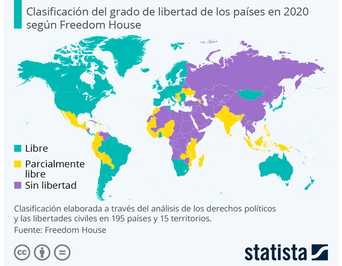 Sociedá El mapa de la llibertá nel mundu entama nos países nórdicos by asturnet 10 de marzu, 2021 written by asturnet 10 de marzu, 2021 4,4K Freedom House publicó’l so informe Llibertá nel Mundu 2021 y lo qu’amuesa nun camuda la perceición d’años p¡atrás: los países consideraos como más llibres fueron, por esti orde, Suecia, Noruega, Finlandia, Nueva Zelanda, Canadá y Uruguai. Con esti informe de calter añal, la organización non gubernamental ufierta una clasificación de los países más y menos llibres del mundu. Según l’informe d’anguaño, 2020 foi’l 15º añu consecutivu d’amenorgamientu de la llibertá a nivel mundial. Ciudadanos de 73 países esperimentaron un deterioru de los sos derechos políticos y llibertaes civiles, ente que namá los de 28 esperimentaron meyores. Esta clasificación de los países según el so grau de llibertá realizase en base a una puntuación amestada de derechos políticos y de llibertaes civiles, que determina la condición de llibre, parcialmente llibre o non llibre de cada país o territoriu. Freedom House determinó que, en 2020, el 39,5% de la población (83 de los 210 países y territorios evaluaos) yera llibre, el 30% (63 países y territorios) parcialmente llibre y el 30,5% (64 países y territorios) vivía ensin llibertá. En 2020, según l’informe, los países consideraos como más llibres fueron, por esti orde, Suecia, Noruega, Finlandia, Nueva Zelanda, Canadá y Uruguai. A la fin de la llista figuren Corea del Norte, Turkmenistán, Eritrea, Sudán del Sur y Siria, que cierra la clasificación siendo’l país con menor llibertá del mundu. 0 FacebookTwitterPinterestEmail Anterior La Formación Profesional va ser protagonista del mercáu llaboral nos próximos años siguiente Avilés presenta 19 iniciatives para optar a fondos europeos del plan “España Puede” Tamién te podria gustar Asturnews va tornar tres del branu con nuevu... Iniciativa pol Asturianu y Barbón desixen a Adif... Iniciativa reclama un mandatu marcu na RTPA Payares acueye les XLI Xornaes Internacionales d’Estudiu de... L’Atles llingüísticu del Navia-Eo ponse n’accesu llibre Aína entama’l cursu políticu con un actu n’Uviéu La Delegación asturiana en Lorient protagoniza la xornada... La UABRA aporta a la segunda selmana d’actividaes 4200 firmes sofiten la música n’asturianu en XIxón Blanca Fernández foi la pregonera de la XXVII...