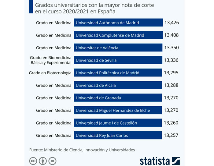 Educación Los graos universitarios cola nota de corte más alta siguen siendo de Medicina by redacción asturnews 4 de xunu, 2021 written by redacción asturnews 4 de xunu, 2021 4,2K El Miercoles dio empiezu n’España la EBAU (Evaluación de Bachilleratu d’Accesu a la Universidá), enantes conocida como Selectividá. Los estudiantes de Murcia fueron los primeres en realizar les pruebes d’accesu a la Universidá de 2021, que se van allargar hasta’l 17 de xunu n’Andalucía, la comunidá que más tarde fai los exames. Cola realización d’estes pruebes, los estudiantes de too el país apostaránse les places de les carreres que deseyen estudiar y van conocer si consiguieron aportar a elles una selmana dempués, cuando reciban unes resultancies provisionales. Como amuesa esta infografía de Statista, los alumnos que quieran realizar un grau universitariu’l próximu cursu tendrán de cuntar en munchos de los casos con una nota d’accesu bien alta. El Grau en Medicina na Universidá Autónoma de Madrid ye’l que cunta con una nota de corte más alta, con 13,426 sobro 14 de nota mínima riquida nel cursu 2020/2021, según datos del Ministeriu de Ciencia, Innovación y Universidaes. El segundu y tercer grau que más nota riquieron en 2020 fueron tamién los de Medicina, na Universidá Complutense de Madrid y na Universitat de València, respectivamente. La nota de corte ye la nota mínima esixida l’añu anterior p’aportar a un determináu grau y la so puntuación corresponder cola del postreru alumnu o alumna qu’entró en dichu grau. Fuente: https://es.statista.com 0 FacebookTwitterPinterestEmail Anterior “Ciencia en Redes” atiende a la comunicación notres llingües del Estáu siguiente Abrió en La Vega la I Selmana Profesional del Arte d’Uviéu Tamién te podria gustar Asturnews va tornar tres del branu con nuevu... Ventanielles y Guillén Lafuerza van ser una “Fábrica... La UABRA aporta a la segunda selmana d’actividaes L’ALLA abre’l plazu pa los cursos de la... “Misteriu nel Soterrañu” algama’l premiu Alfonso Iglesias de... Tapia acueye la presentación del II Premiu «Quiastolita»... El Principáu y la UOC firmen un conveniu... Asturies destaca en comprensión llectora L’IES Real Institutu Xovellanos entama sos primeres Xornaes... Xornada Evaluación de programes educativos