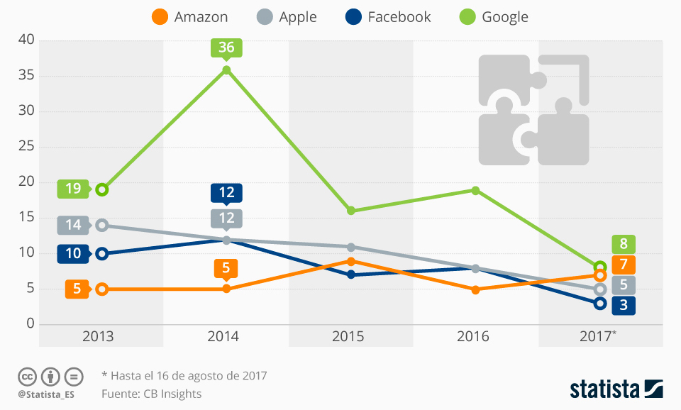 Tecnoloxía Los xigantes tecnolóxicos baxen el ritmu de compra d’empreses by redacción asturnews 7 d'avientu, 2017 written by redacción asturnews 7 d'avientu, 2017 139 Dende 2013 hasta agostu mediaos de 2017, ente Facebook, Google, Amazon y Apple adquirieron o se fundieron con más de 200 empreses (219, pa ser esactos), siendo Google la más activa nesti menester. Les grandes corporaciones de la tecnoloxía traten d’introducise en cada vez más mercaos con nuevos productos d’última xeneración. Los asistentes intelixentes, la tecnoloxía de realidá virtual y aumentada y el vehículu ensin conductor son solo dellos exemplos de la diversidá d’oportunidaes a les qu’estes empreses traten d’echa-y el diente. Una de les maniobres qu’usen esta compañíes para salir airoses de cualesquier d’estes aventures empresariales ye mercar o fundise con una organización que yá sían líderes nel segmentu en cuestión. Asina, como amuesa esta infografía de Statista, dende 2013 hasta agostu mediaos de 2017, ente Facebook, Google, Amazon y Apple adquirieron o se fundieron con más de 200 empreses (219, pa ser esactos), siendo Google la más activa nesti menester. Sicasí, como amuesa esta infografía de Statista, según un artículu de CB Insights, les grandes corporaciones tán baxando’l ritmu nesta área. Asina, mientres en 2014 realizáronse un total de 65 d’estes operaciones, en 2015 estes llindáronse a 43 y en 2016, a 40. 0 FacebookTwitterPinterestEmail Anterior El CCAI acueye la presentación de “Un cantar a l’amanecida” de Paulino Álvarez siguiente La Hestoria medieval de Xixón a revisión nel CCAI de Xixón Tamién te podria gustar Ventanielles y Guillén Lafuerza van ser una “Fábrica... El Principáu y la UOC firmen un conveniu... Los videoxuegos caltienen sesgos de xéneru Educación aconceya a casi 1600 escolares de 12... Convocáu’l II Concursu de Videopoemes POEX 2023 Nueva ruta de realidá aumentada na Casa Natal... Avilés amuésase como referente de la innovación cola... El binomiu Ciencia y Sociedá centra’l foru Horizonte... Asturies envolúbrate: Paisaxes inmersivos del patrimoniu sonoru asturianu Uviéu TECH, “la to cita col futuru”, abre’l...