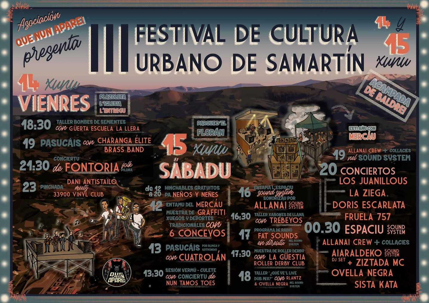 ConceyosConvocatoriesFiestes Que Nun Apare! va enllenar Samartín de cultura urbano by redacción asturnews 10 de xunu, 2019 written by redacción asturnews 10 de xunu, 2019 212 El 14 de xunu en L’Entregu y el 15 nel Parque d’El Florán va cellebrase la tercera edición del festival de Cultura Urbano con 18 actividaes ente les qu’hai deporte, xuegos, talleres y música. L’asociación xuvenil Que Nun Apare! vuelve con más puxu que nunca y esti añu amplía’l so festival a dos díes de duración. El 14 y 15 de xunu, Samartín va acoyer la tercer edición d’esti eventu qu’axunta un total de dieciocho actividaes bien variaes rellacionaes col deporte, la cultura hip hop y reggae, les tradiciones asturianes, la música, los xuegos y la educación. Too ello con entrada de baldre y pa tolos públicos. El vienres 14 la Plazoleta La Ilesia de L’Entregu centra toles actividaes pa esi día. A les 18.30h arranca’l programa col taller “Bombes de Semientes” impartíu por Güerta Escuela La Llera pa llueu dar protagonismu a la música con un pasucais de la Charanga Elite Brass Band (19h), un conciertu del grupu folk Fontoria (21.30h) y la sesión de DJ “Dani Antistailo meets 33900 Vinyl Club” (23h). Al día siguiente la diversión y la cultura nun van aparar nel Parque d’El Florán. De 12 a 20h hai xuegos hinchables pa neños y neñes, amás d’un mercáu d’asociaciones, comida, artesanía y caxigalines varies, l’amuesa de graffiti y los xuegos y deportes tradicionales con 6 conceyos. La bandina folk de Blimea Cuatrolán va percorrer a la una’l mediudía les cais de Sotrondio y Blimea enantes de dar pasu a la sesión “vermú-culete” cola actuación de les pandereteres feministes Nun Tamos Toes. Pela tarde arranquen les actividaes más rellacionaes cola cultura urbano más alternativo. La sound system –sistema de soníu de caxes de madera, ambulante y con orixe xamaicanu- del colectivu asturianu Allanái va facer qu’El Florán baille a ritmu de la música reggae a partir de les 16h. Nesti espaciu amás va facese y emitise en directo’l programa de Radio QK (107.3FM) Fat sounds a les 17h y el taller “¿Qué ye’l Live dub mix?” con Rlantz & Ovella Negra (18h). Les actividaes de la tarde complétense col taller d’ellaboración de xabones de llana con Trebeyos (16.30h) y l’amuesa del club La Güestia Roller Derby alrodiu esti deporte de contactu sobre patines orixinariu d’Estaos Uníos y mayoritariamente femenín (17.30h). Los conciertos van ser de 20h a 00.30h y nellos van actuar el dúu de versiones Los Juanillous, los conxuntos de rap La Ziega y Doris Escarlata y el Dj de música folk-electrónica Fruela 757. El ramu ponlu la sound system, qu’hasta bien entrada la nueche va tar funcionando cuntando coles esbilles de distintos estilos de reggae de los asturianos Allanái Crew, los vascos Airaldeko Crew y el productor gallegu Ovella Negra, too ello cola collaboración d’otros y otres artistes de la escena asturiana y les cantantes Ziztada Mc de Bilbao y Sista Kata d’Irún. Con esta nueva edición, Que Nun Apare! da continuidá al éxitu d’esti festival que nació en 2017 col oxetivu d’enllenar el vacíu que dexó la non celebración de les tradicionales fiestes de La Llaguna. Una programación cultural y d’ociu diversa; poniendo en valor la interculturalidá, el papel de la muyer y la llingua asturiana; y na que la mocedá seya la protagonista; son les claves d’esti eventu autoxestionáu y ensin ánimu d’arriquecimientu que se celebra por tercer añu gracies al sofitu popular, al comerciu y la hostelería de Samartín, y a toles asociaciones, persones y artistes que participen. 10 con vasos reutillizables personalizaos y una zona d’acampada’l sábadu pa la pernocta de la xente festivalero. 0 FacebookTwitterPinterestEmail Anterior El Teatru Palacio Valdés acueye trés estrenos absolutos n’EscenAvilés siguiente #FeLiX19: un taller de creación de Llibros animaos pala Feria’l Llibru Tamién te podria gustar Iniciativa pol Asturianu y Barbón desixen a Adif... Payares acueye les XLI Xornaes Internacionales d’Estudiu de... L’Atles llingüísticu del Navia-Eo ponse n’accesu llibre Nun Tris abre les Xornaes del Festival Nel... El Trasiegu Fest conclúi col envís de poner... El Trasiegu Fest va tener un mercáu con... Aína entama’l cursu políticu con un actu n’Uviéu Ventanielles y Guillén Lafuerza van ser una “Fábrica... La UABRA aporta a la segunda selmana d’actividaes Barry B pieslla’l cartelu del Festival VESU