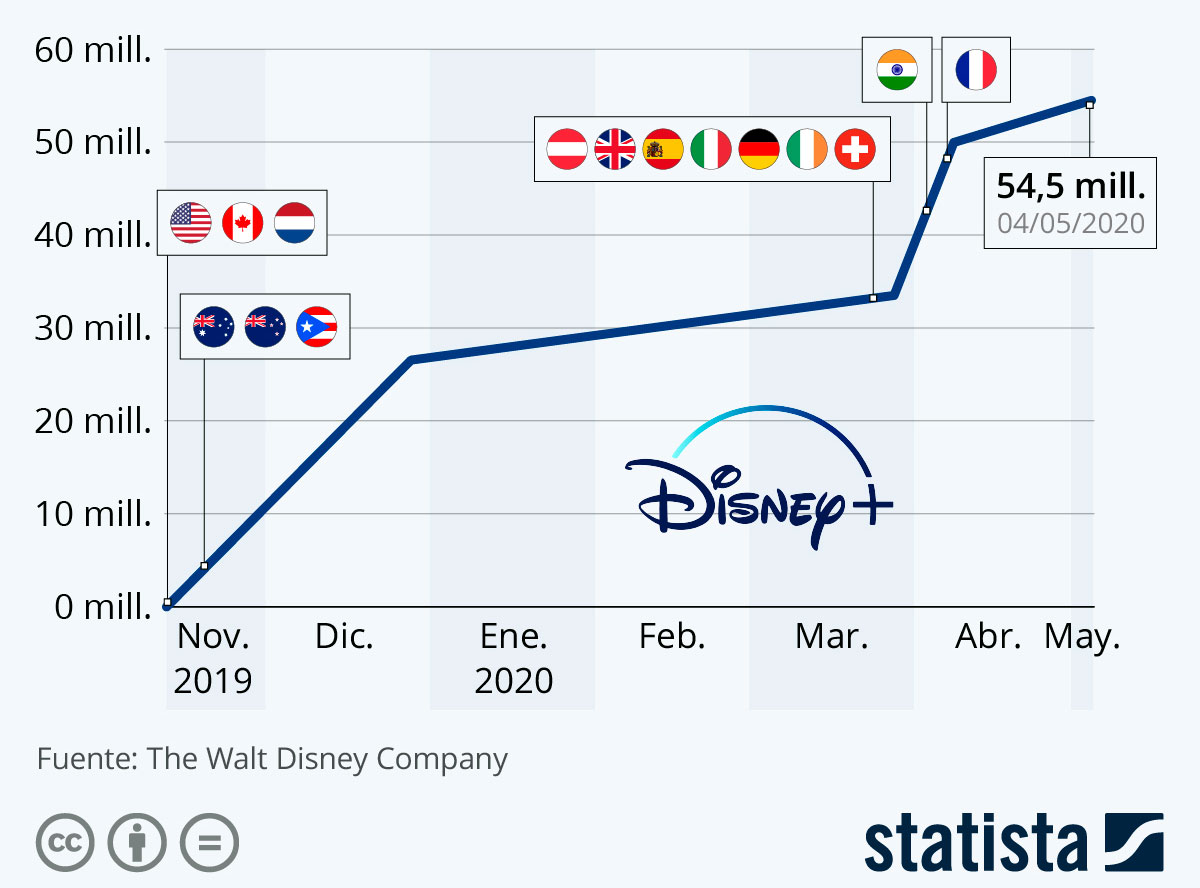 CineTecnoloxía Disney+ supera los 50 millones de suscriptores by redacción asturnews 11 de mayu, 2020 Esta selmana la empresa The Walt Disney Company anunció que la so nueva plataforma de streaming de vídeu algamó los 54,5 millones de suscriptores de pagu. Siguir lleendo 11 de mayu, 2020 0 FacebookTwitterPinterestEmail