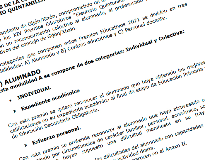 ConceyosEducación Xixón convoca los XIV Premios Educativos “Eleuterio Quintanilla” by redacción asturnews 14 d'avientu, 2021 written by redacción asturnews 14 d'avientu, 2021 4,4K El Conceyu de Xixón, comprometíu na acción educativa de la ciudá, convoca los XIV Premios Educativos “Eleuterio Quintanilla” 2021. Estos premios suponen una reconocencia colectiva al alumnáu, al profesoráu y a los centros educativos del conceyu. Solamente van poder allegase a estos premios los centros educativos de Xixón, tantu públicos como privaos alcordaos. Les candidatures pueden presentase hasta’l 28 d’ochobre al traviés del rexistru electrónicu del Conceyu. Bases de la convocatoria Anexos de la convocatoria Centru de Cultura Antiguu Institutu Organizador: Departamentu d’Educación 13 d’avientu de 2021 De 17:30 a 18:30 0 FacebookTwitterPinterestEmail Anterior El proyectu BIGOTT aporta al Xovellanos siguiente Abiertes hasta’l día 20 les inscripciones pa la TIA de Navidá d’Avilés Tamién te podria gustar Asturnews va tornar tres del branu con nuevu... Iniciativa pol Asturianu y Barbón desixen a Adif... L’Atles llingüísticu del Navia-Eo ponse n’accesu llibre Aína entama’l cursu políticu con un actu n’Uviéu Ventanielles y Guillén Lafuerza van ser una “Fábrica... La UABRA aporta a la segunda selmana d’actividaes Barry B pieslla’l cartelu del Festival VESU San Xuan celebrase en toa Asturies con Xixón... Blanca Fernández foi la pregonera de la XXVII... L’ALLA abre’l plazu pa los cursos de la...